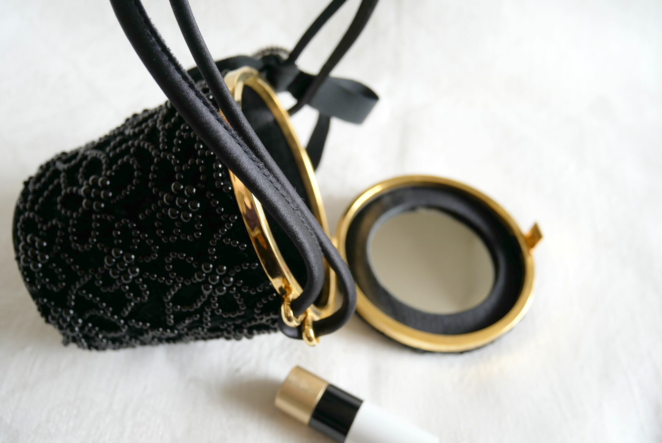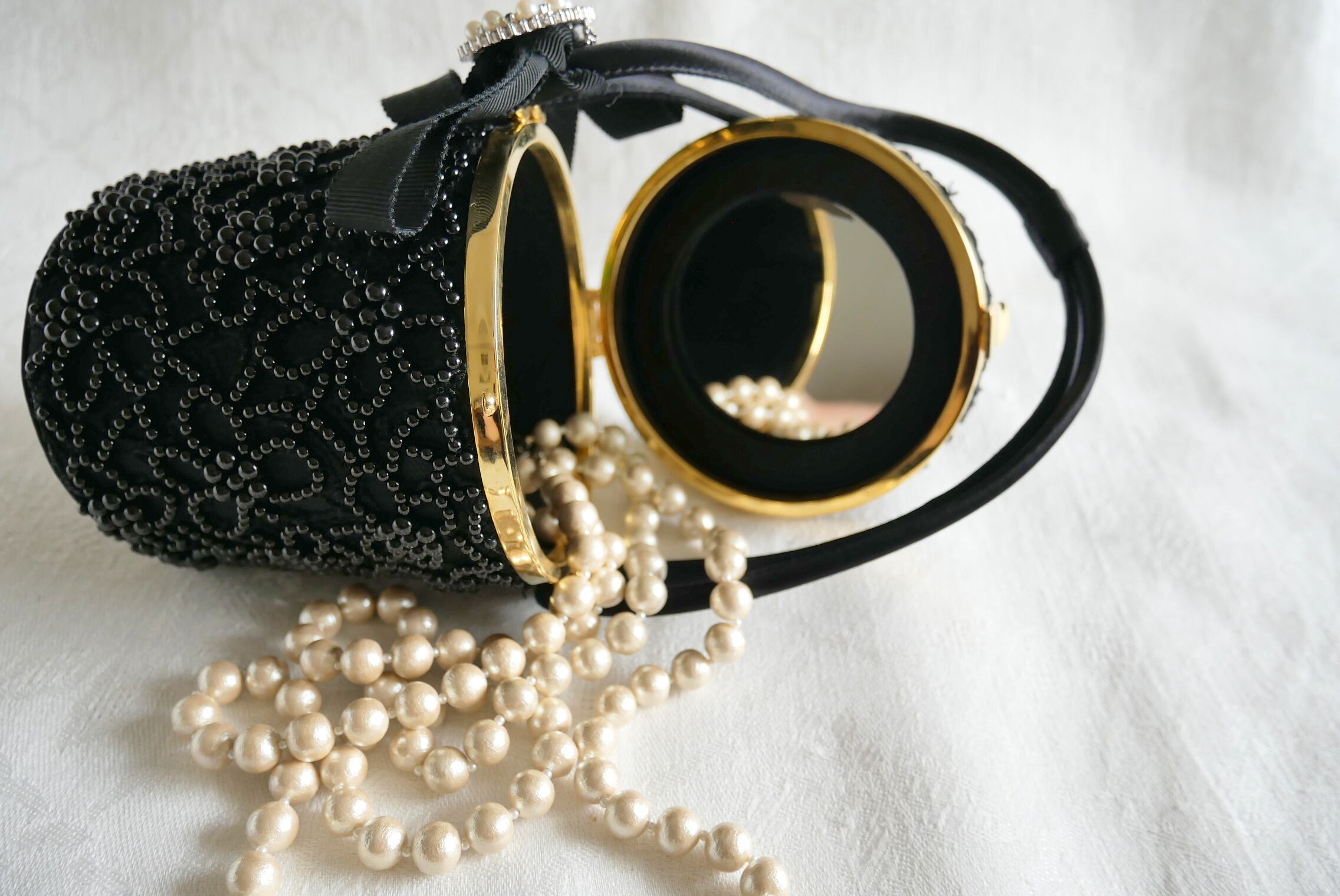 黒ビーズ飾りのエレガントなデザインが印象的なミラー付きバニティバッグ。ハンドバッグやとしてもお使いいただけます。内側には便利なミラーが付いており、いつでもメイクの仕上げや髪型のチェックが簡単にできます。