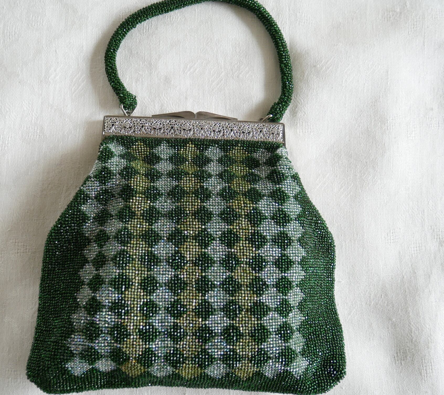 グリーンのモダンな格子模様 オールビーズのハンドバッグ