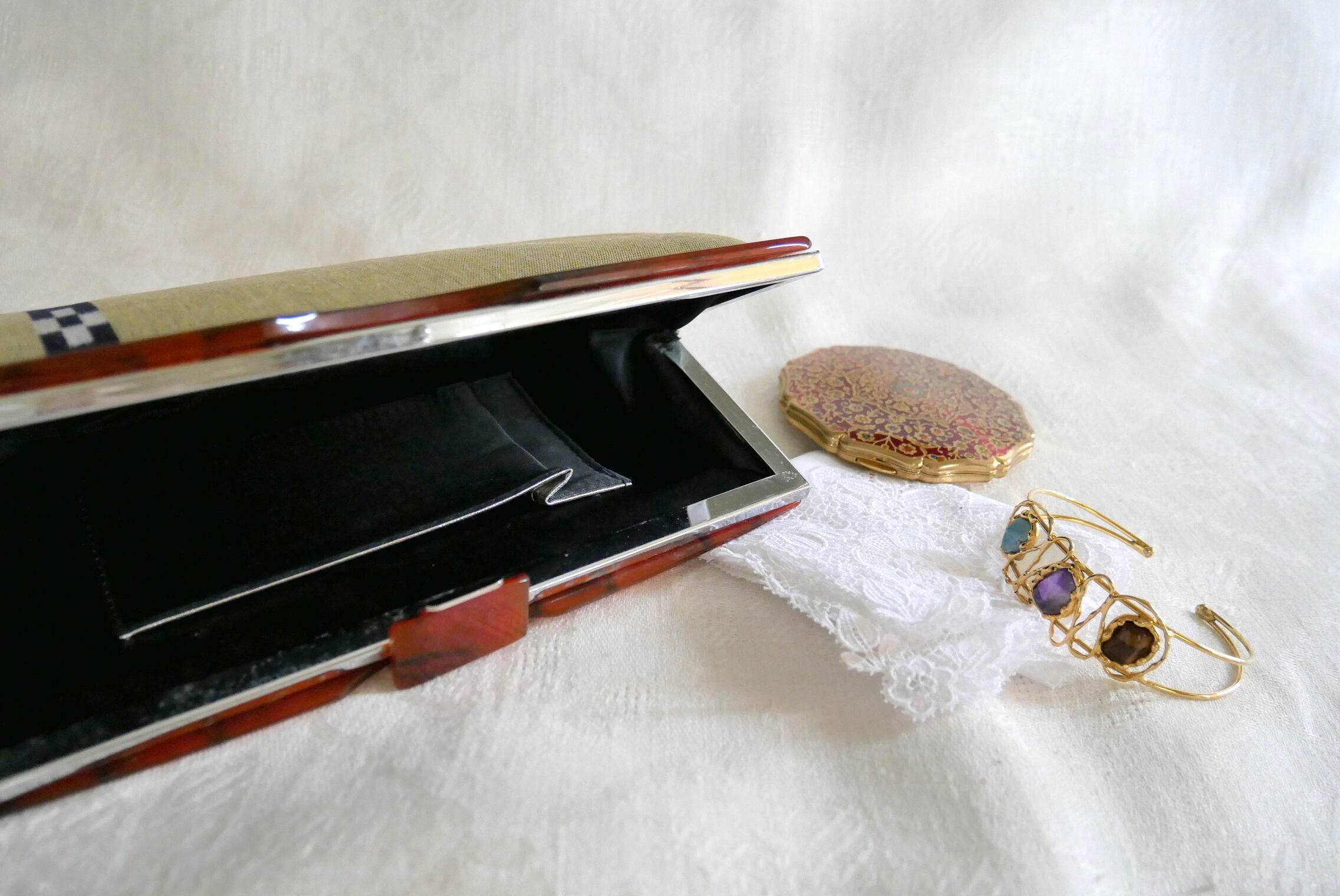 内側は、黒のサテンで、両面に内ポケット付き。