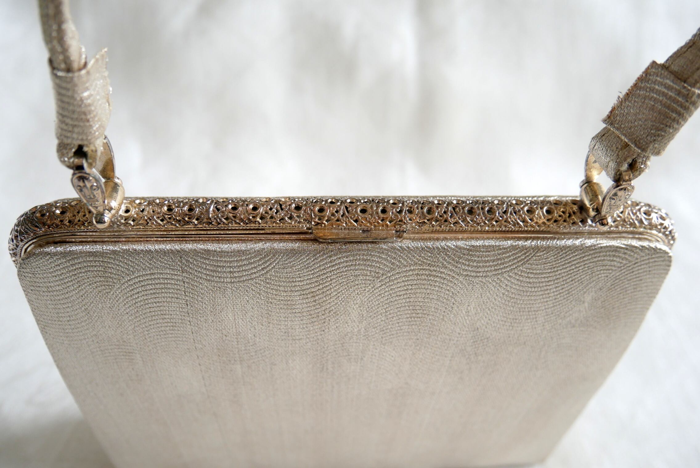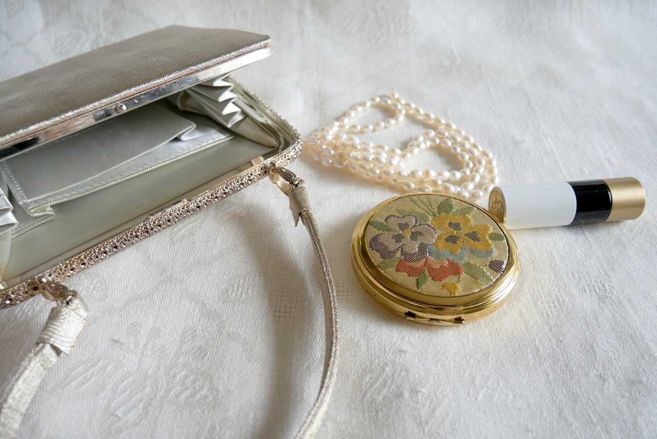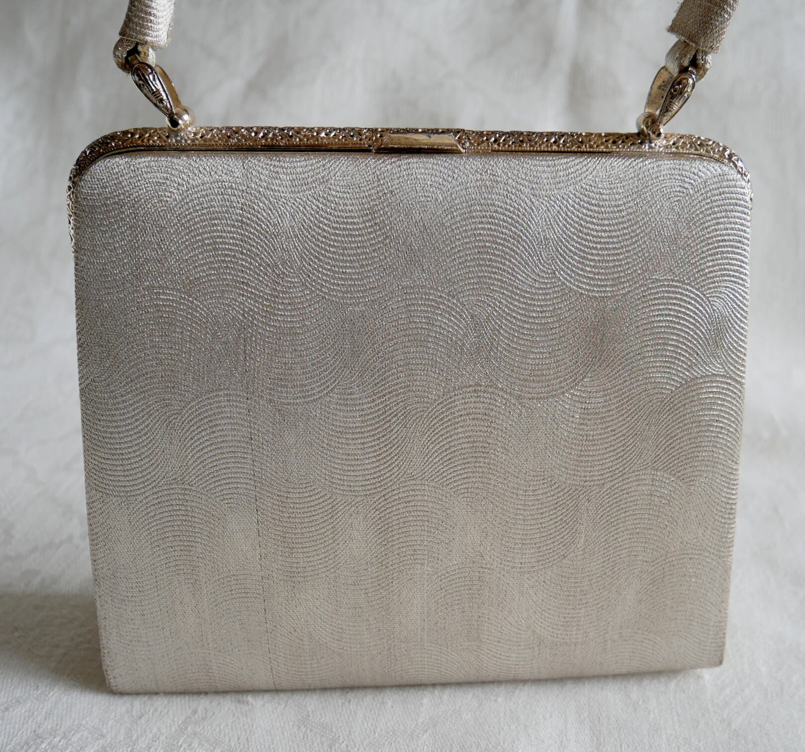 輝きのあるプラチナ色のパーティ&カクテルバッグです。
