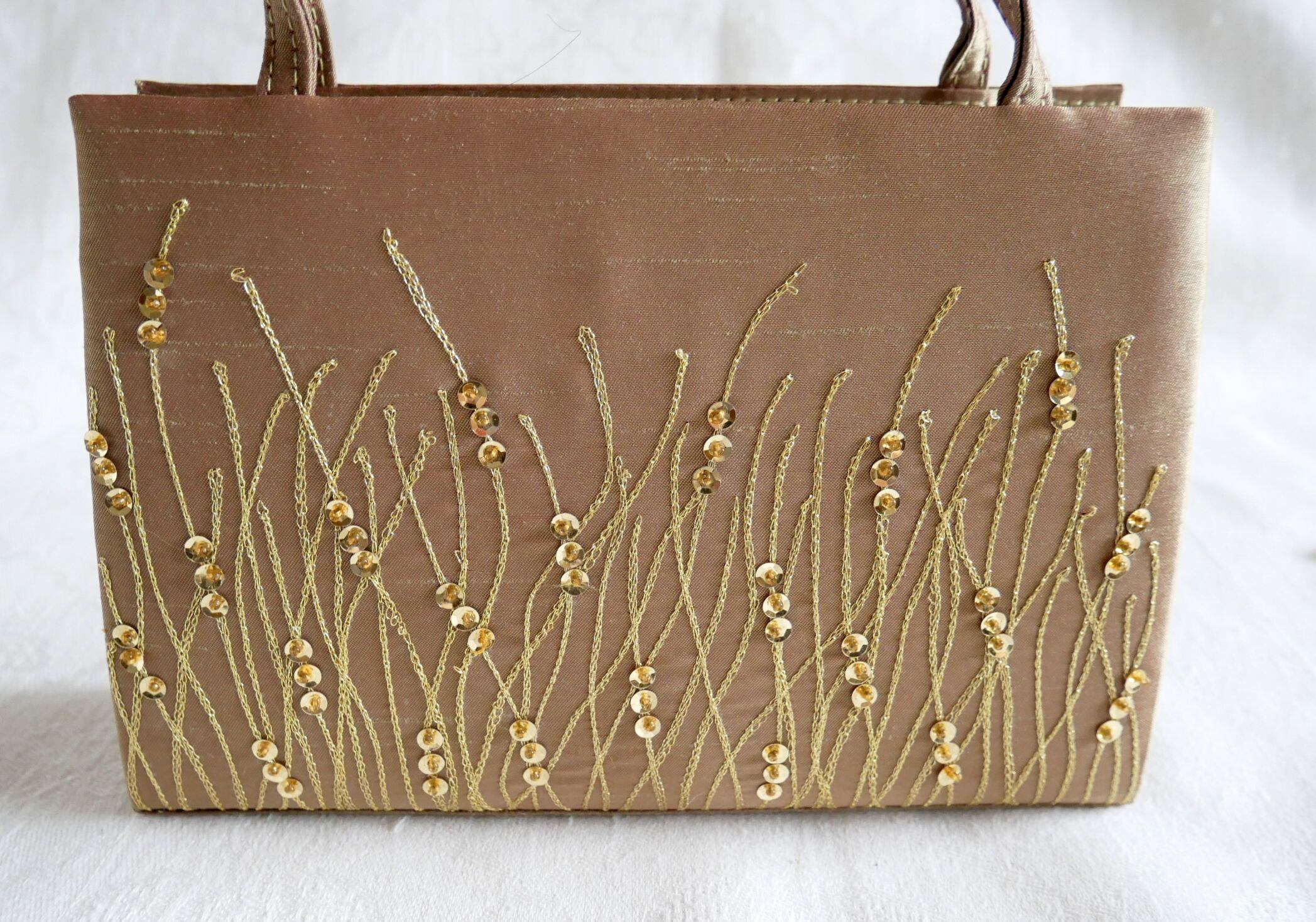 片面のみに、スパンコールと金糸の刺しゅうで装飾を施したバッグです。