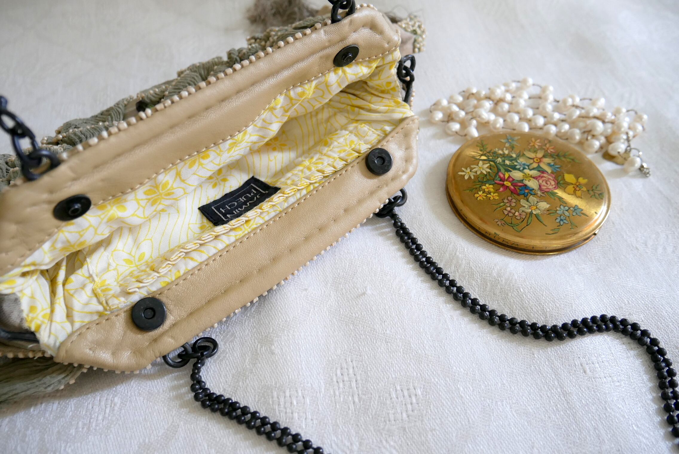 シフォンのフリルとビーズで飾った、手の込んだショルダー&ハンドバッグです。