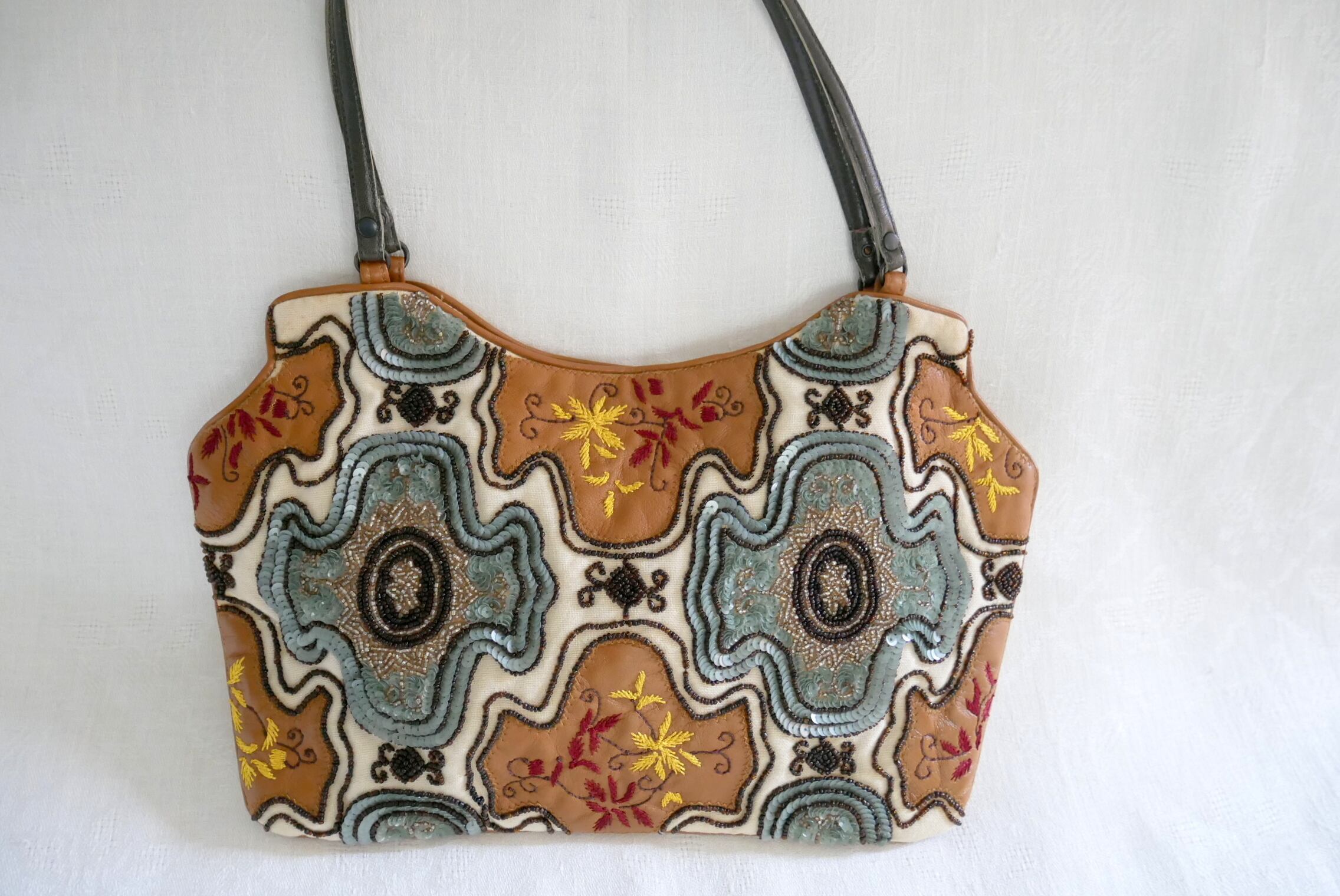 ビーズとスパンコールで、緻密な刺しゅうと装飾がほどこされています。