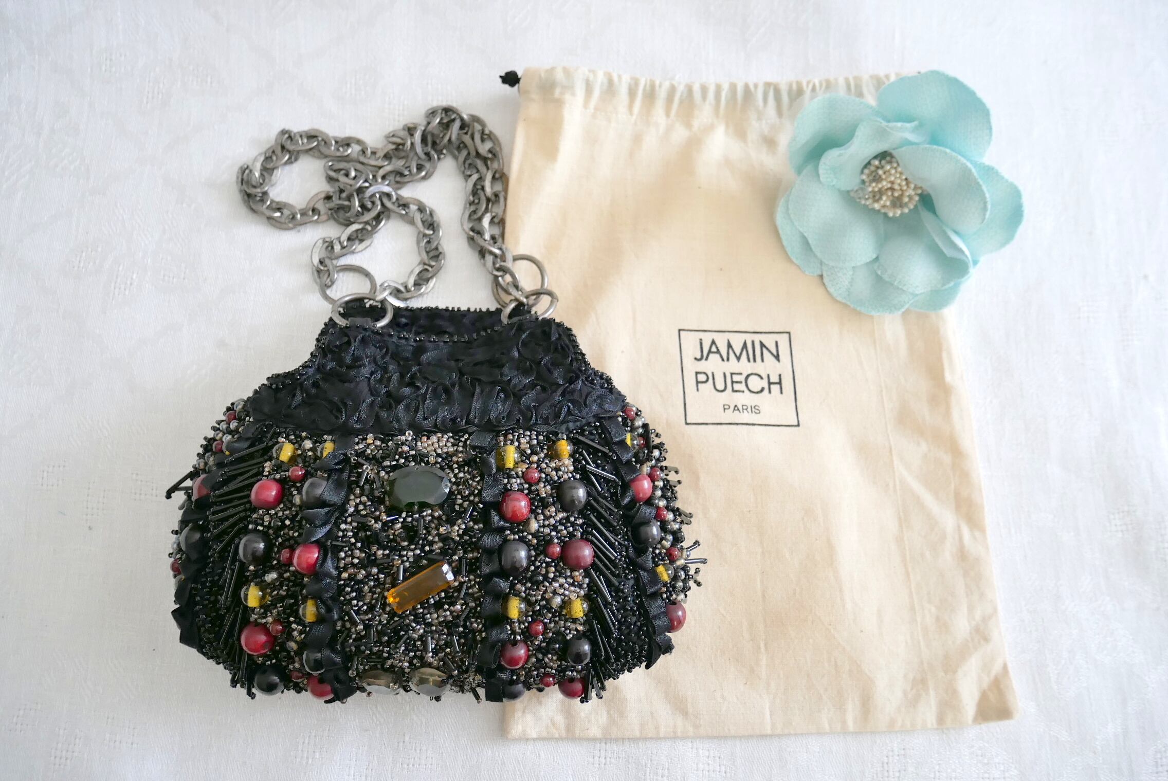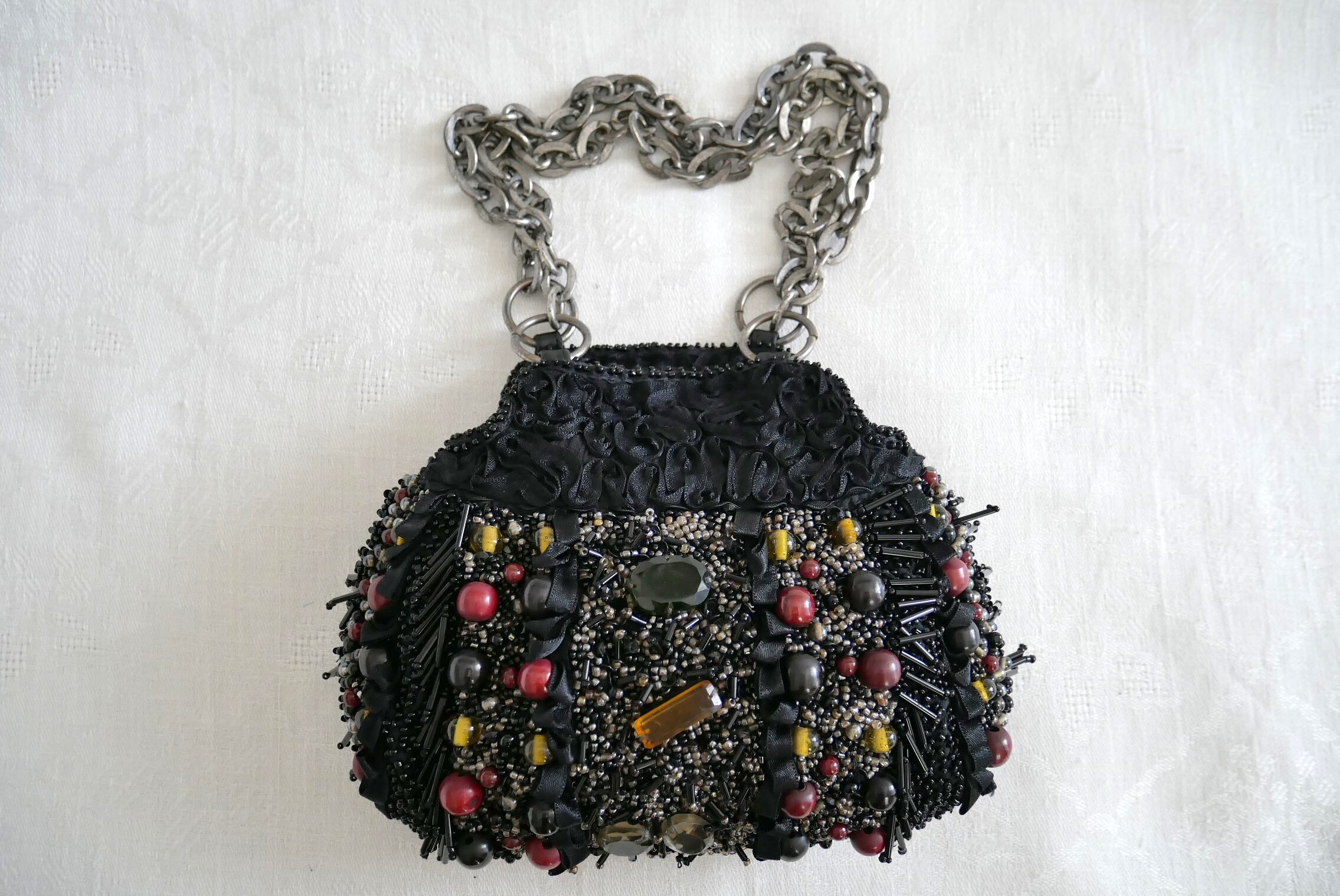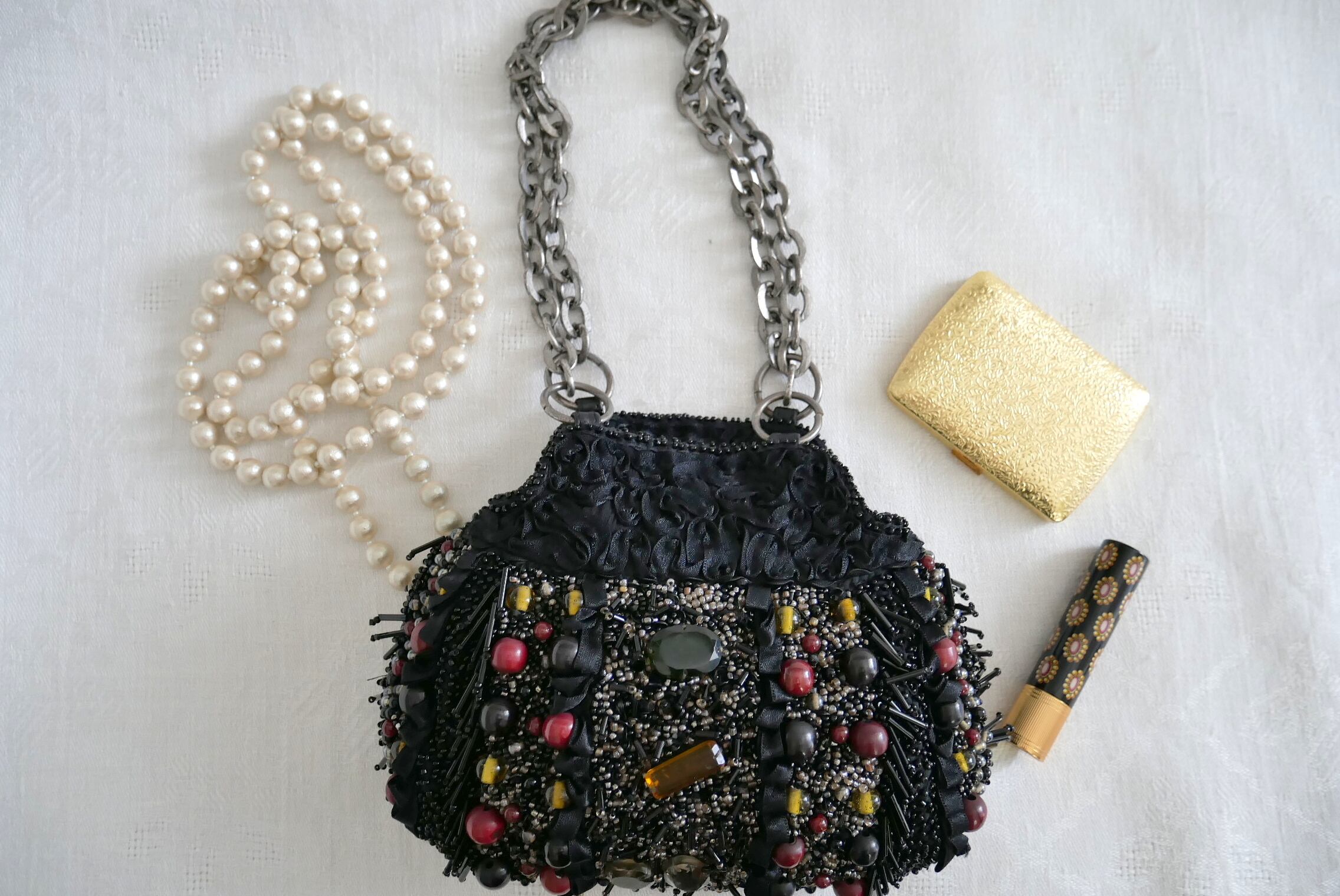 両面ともに、全面的にラインストーンや多様なビーズで飾った
