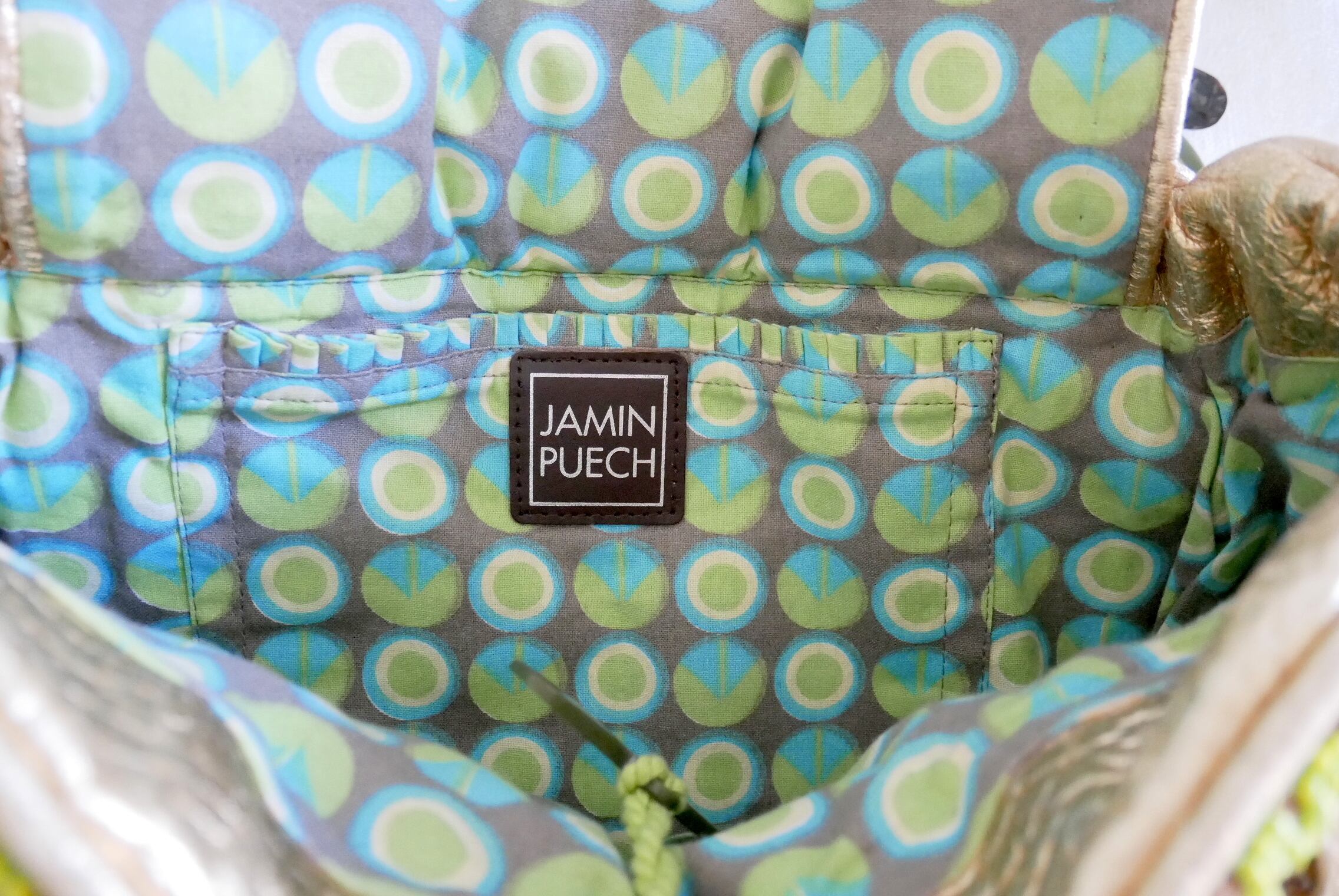 開閉部と底部分はゴールド色のしなやかなレザー製です。