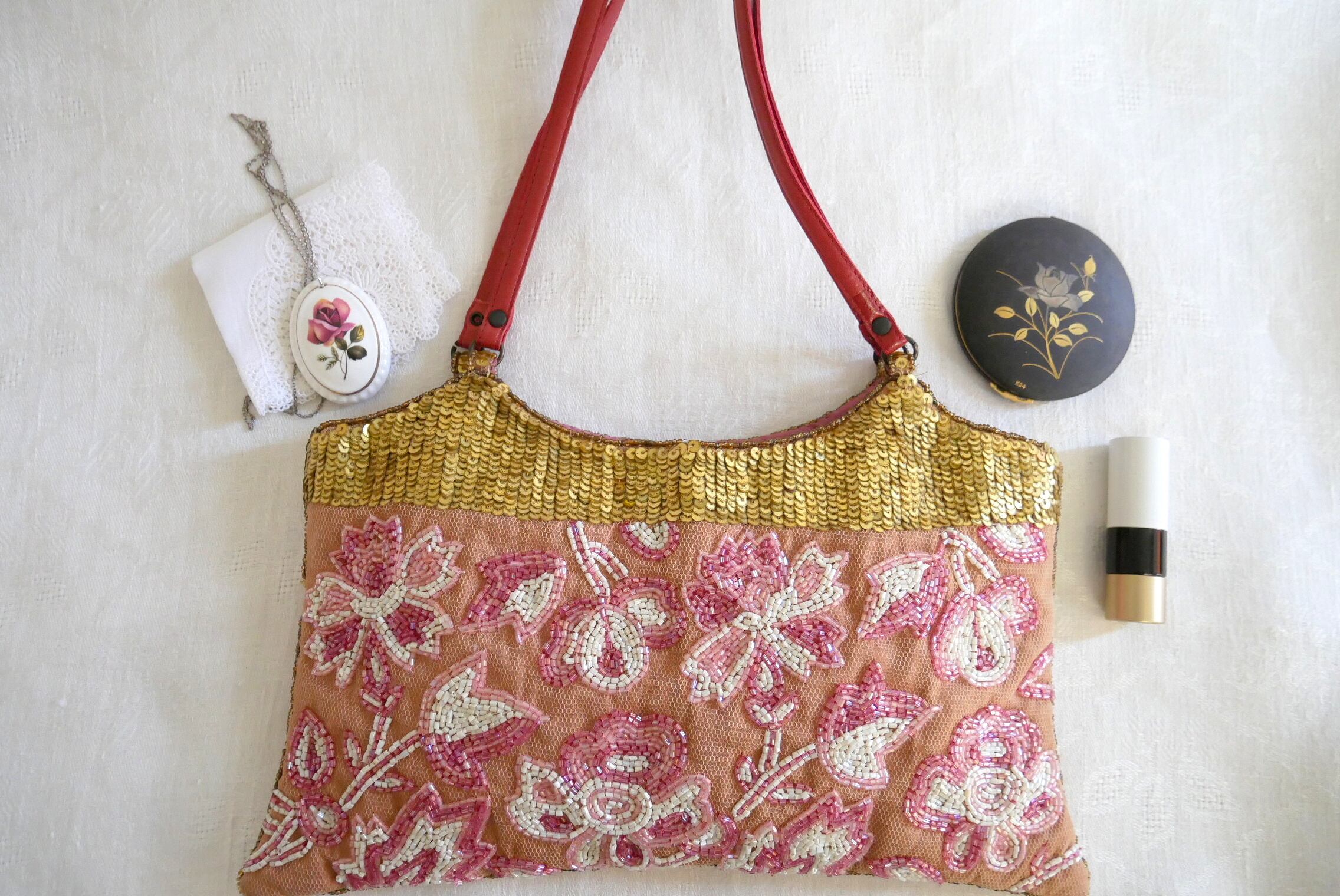 【Jamin Puech Paris】A:ピンク色のビーズの花飾り×ゴールド色スパンコール 赤のハンドルのバッグ