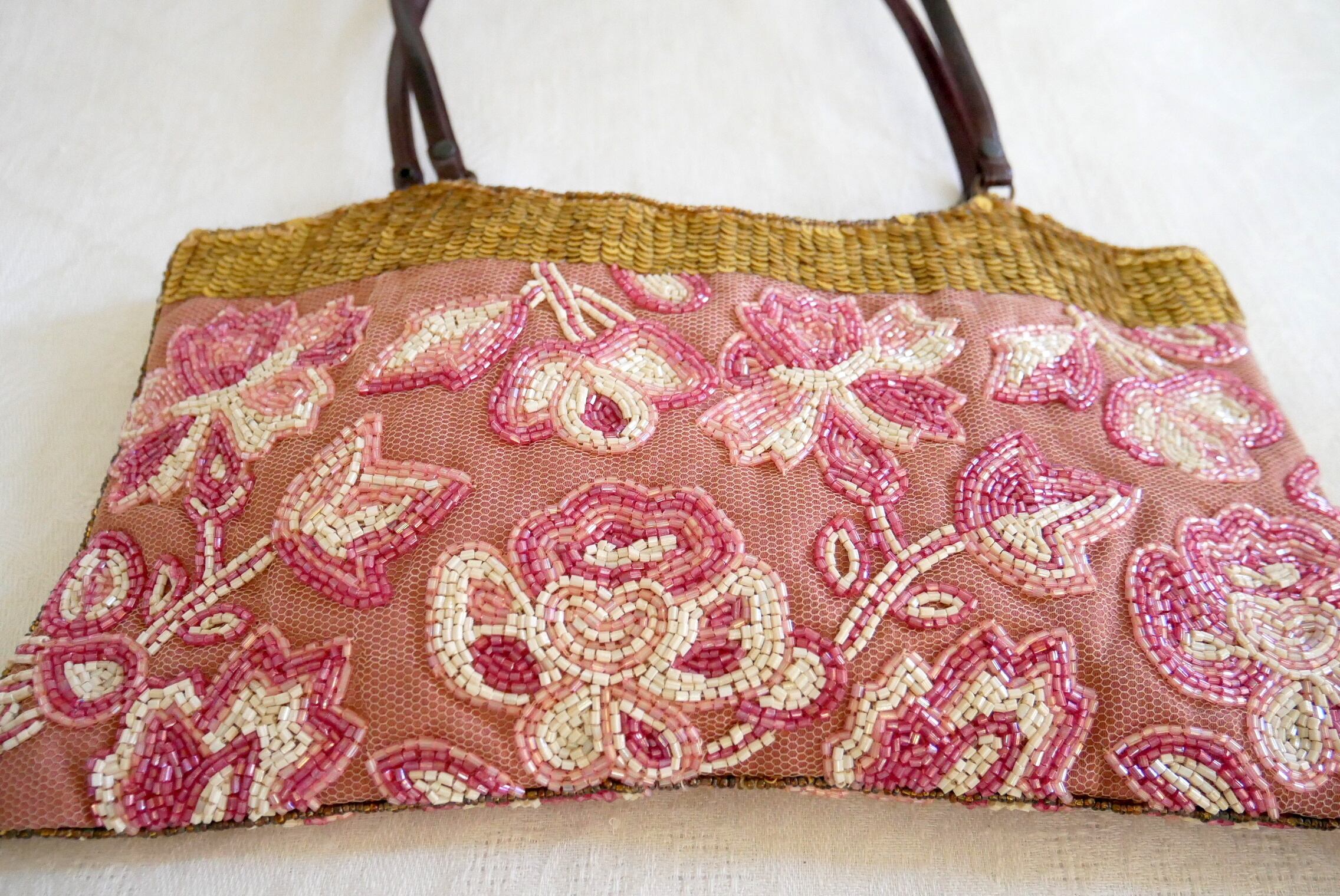 バッグ本体はくすんだピンク色のレーヨン生地で、チュールを重ねてあり、