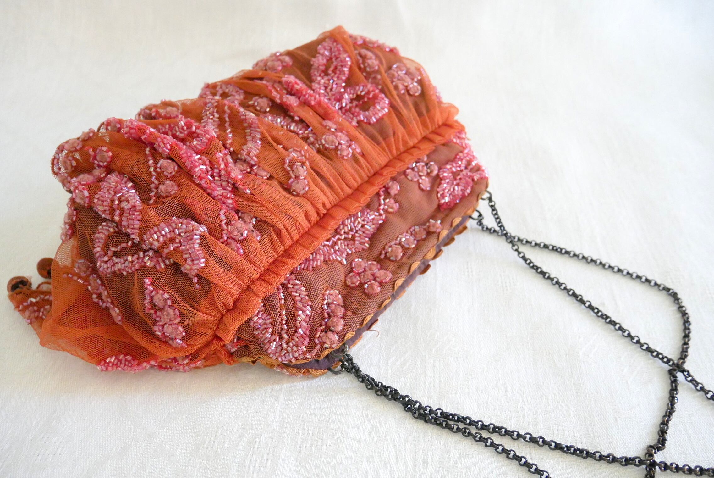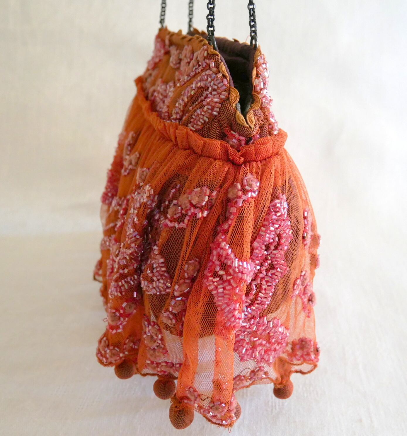 【Jamin Puech Paris】コーラルオレンジ色のチュールにビーズ飾り ハンドバッグ