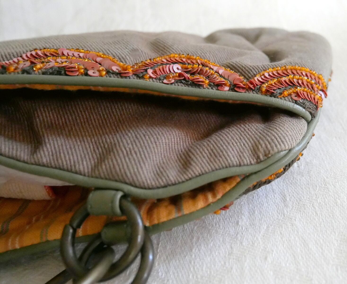 表面は、曲線を描くコード刺しゅうとスパンコールでふんだんな刺繍がほどこされています。