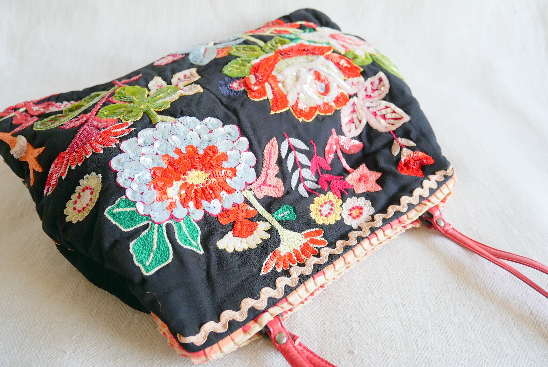 表面は、ふんだんにバラやダリアや小花をスパンコールと刺しゅうでほどこし、